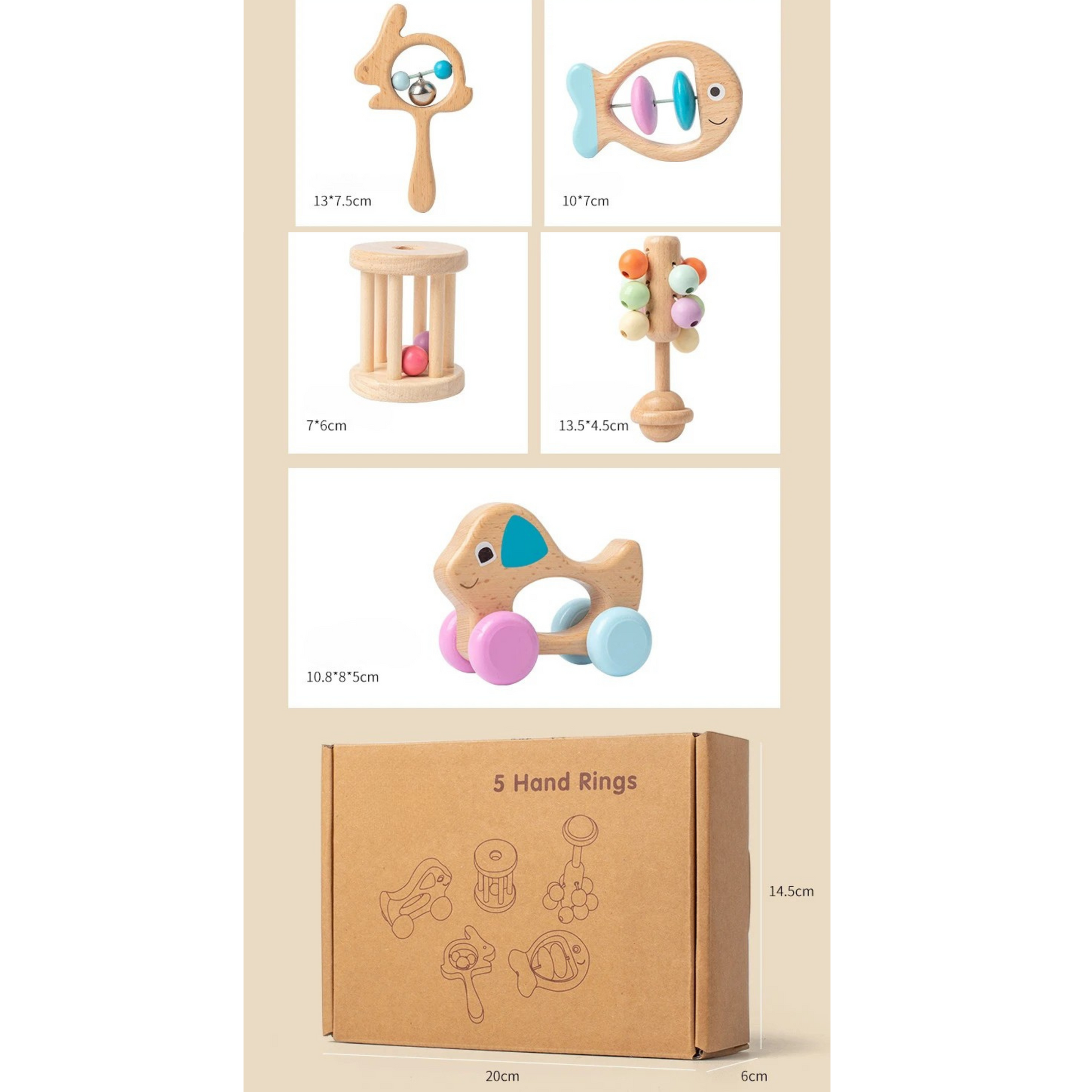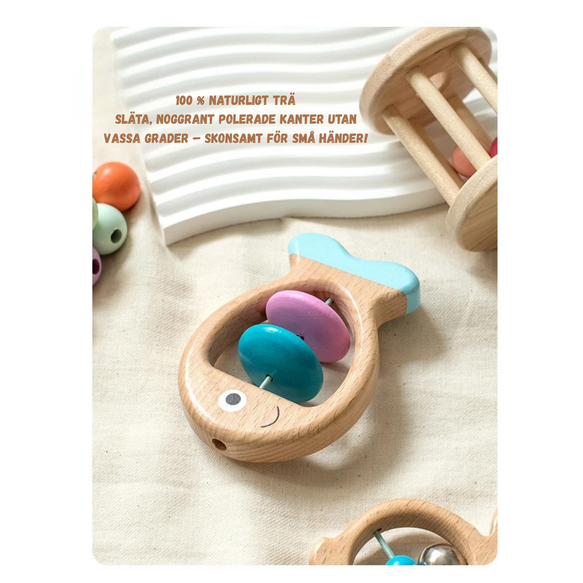 Låt ditt barn utforska färger, former och ljud med detta charmiga träleksakset i fem delar. Designat för små händer att greppa, stapla och skaka – perfekt för att främja finmotorik, nyfikenhet och tidig inlärning.