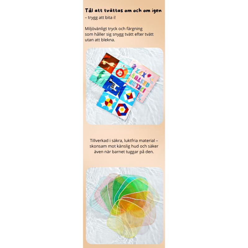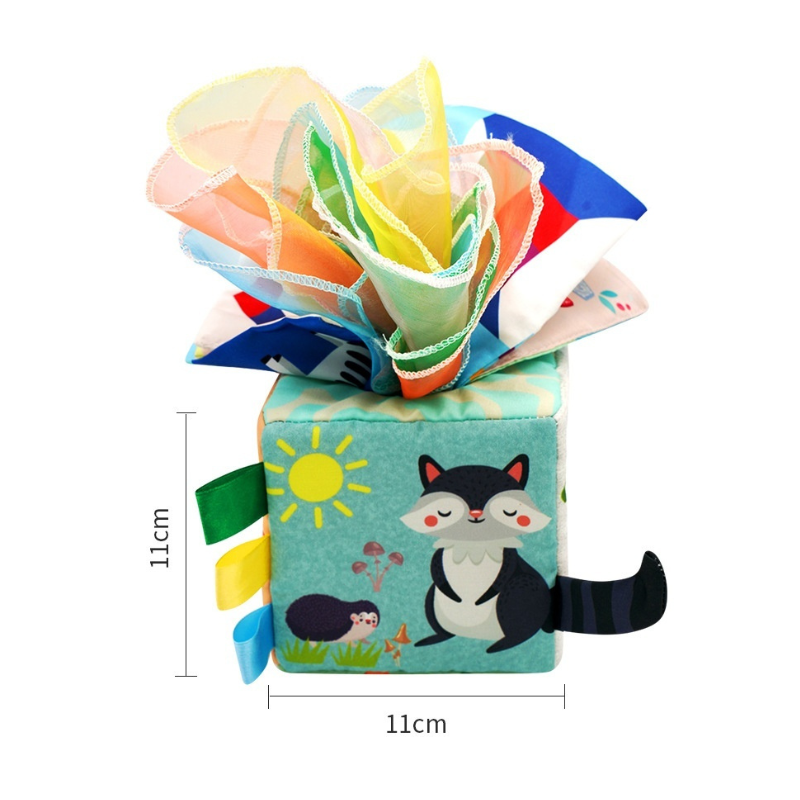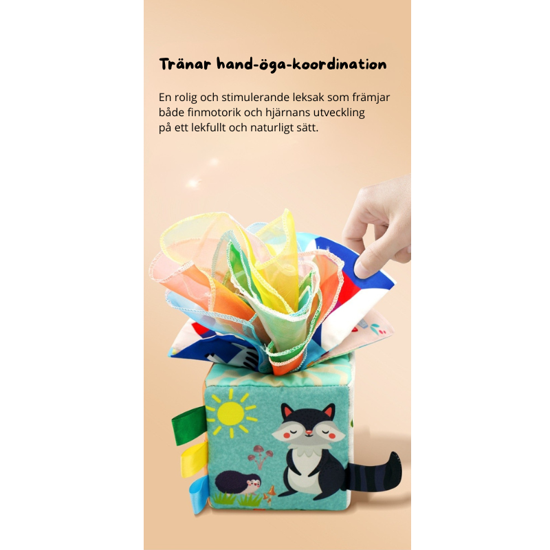 Låt ditt barn upptäcka, dra och utforska om och om igen! Denna mjuka tygbox är fylld med färgglada "näsdukar" av tyg som aldrig tar slut – perfekt för små händer och nyfikna sinnen. Designad för att stimulera barnets motorik, färgigenkänning och känselsinne på ett säkert och roligt sätt.