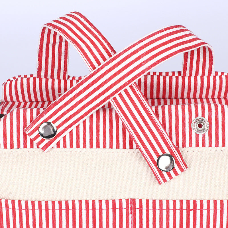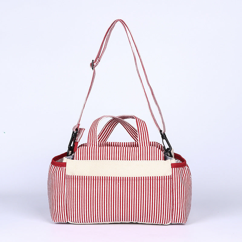 Den här stora och mångsidiga skötväskan är tillverkad i slitstarkt 12A canvas-tyg, som är skonsamt mot din bebis och helt utan skadliga ämnen. Välj mellan två snygga färger: rött med beige band eller svart med beige band.