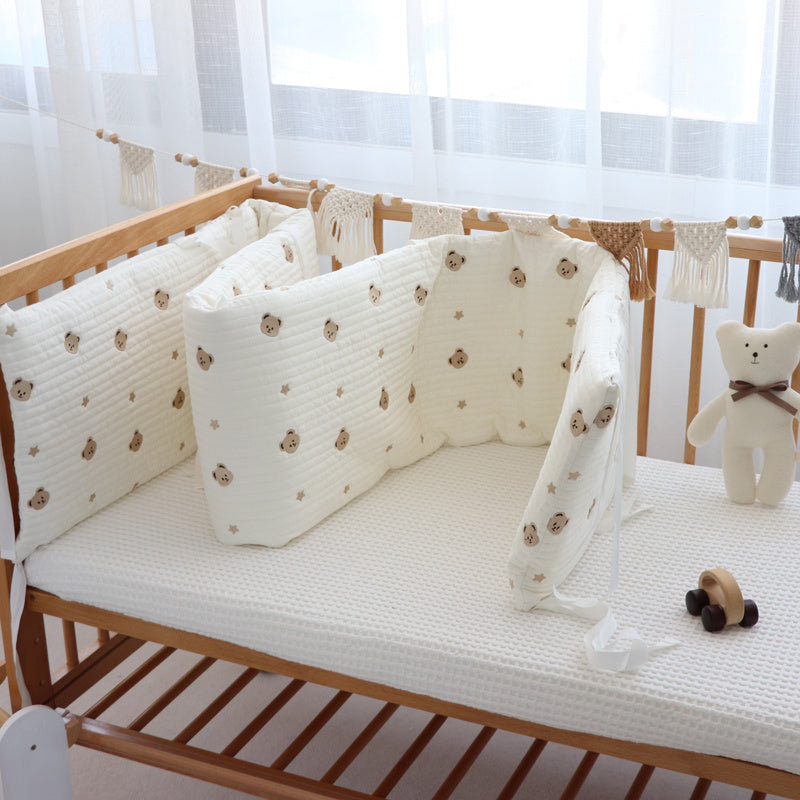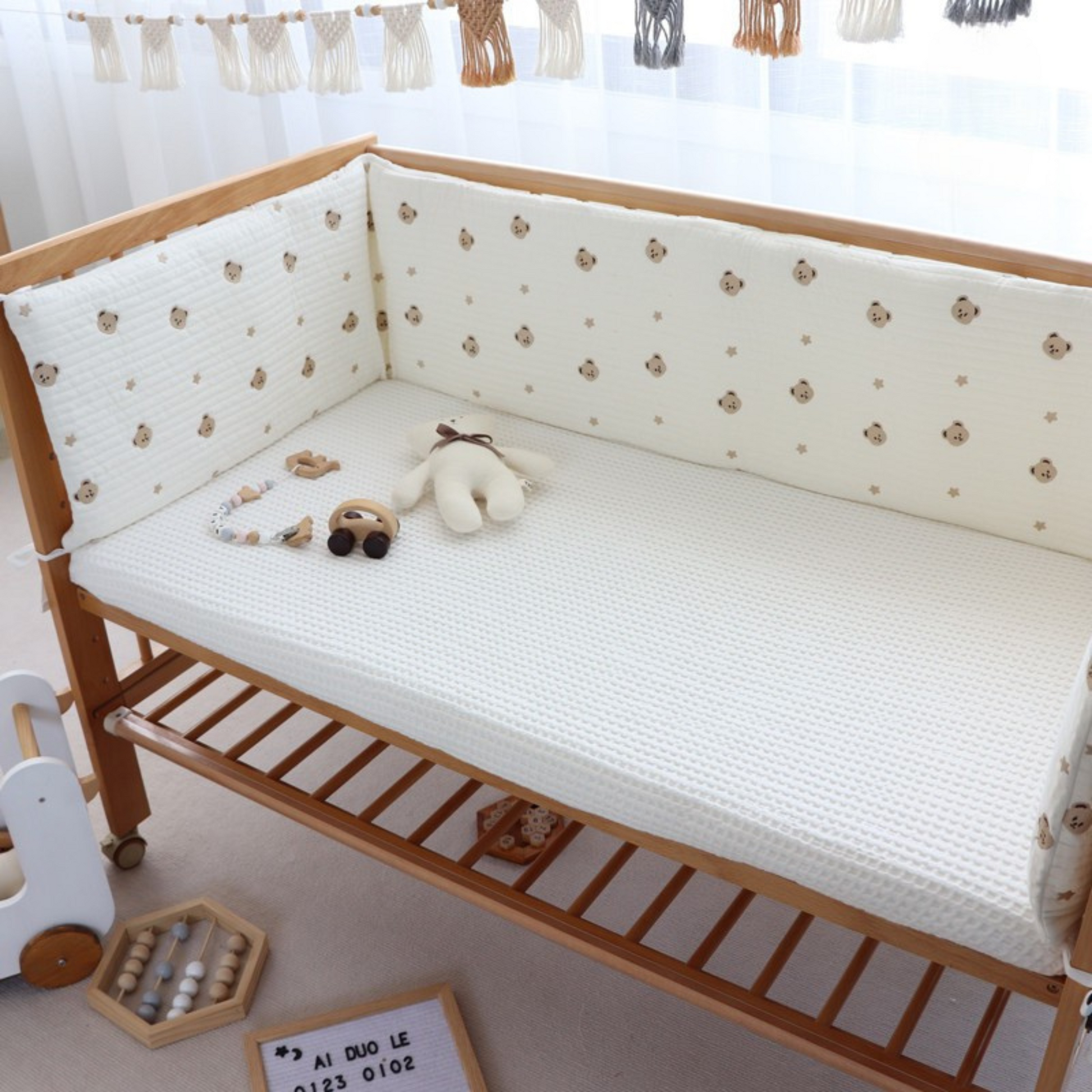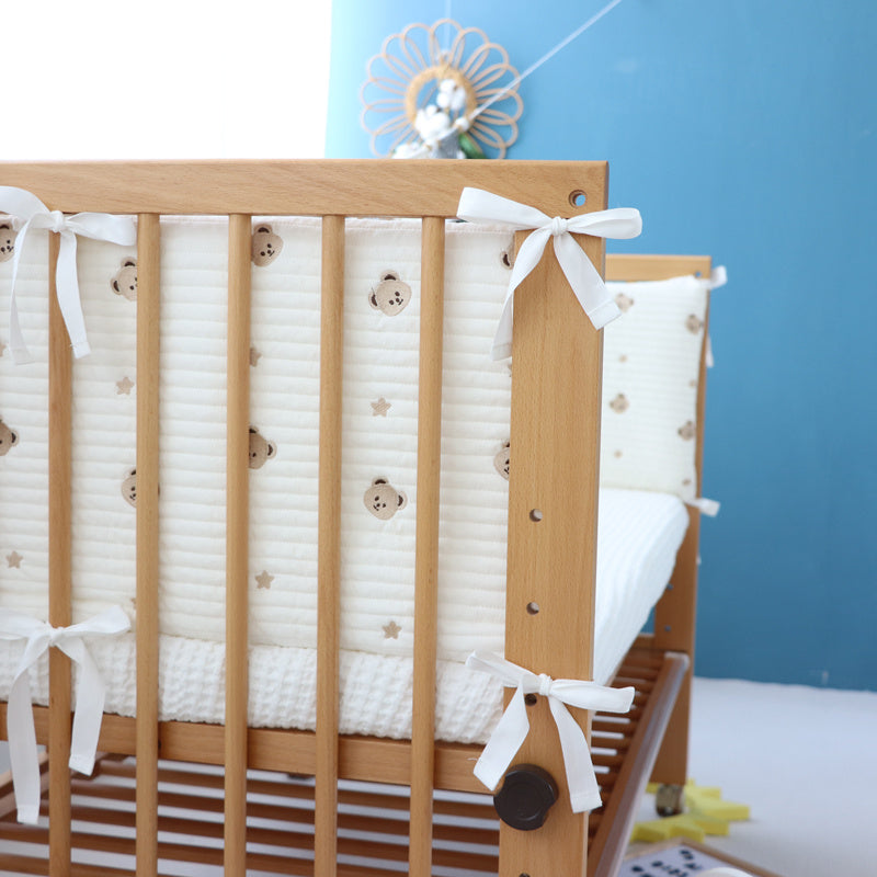 Skapa en trygg och ombonad sovmiljö för din bebis med vårt stilrena sängkantskydd. Den mjuka vadderingen i bomull ger behagligt stöd samtidigt som det skyddar barnet från sängens hårda kanter. Den söta broderade designen adderar en charmig touch till barnrummet.